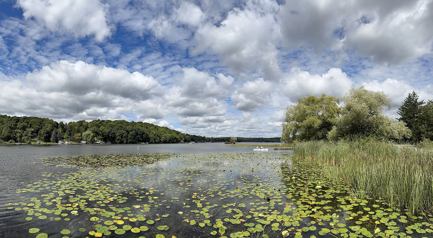 The lakefront has a boat launch, fishing pier, swimming beach and picnic areas.