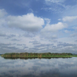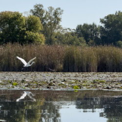 The lake itself is very large and shallow, with a surface area of 2,260 acres and a maximum depth of 4 feet. It has a diverse marsh system with numerous islands of emergent vegetation and floating vegetation islands. The lake is fringed with extensive wetlands, including dense cattail marshes. These habitats are ideal for nesting water birds and marsh birds. The lake offers a unique opportunity to observe breeding Forster’s terns, yellow-headed blackbirds, eagles, ospreys, and many other resident and migratory wildlife species.