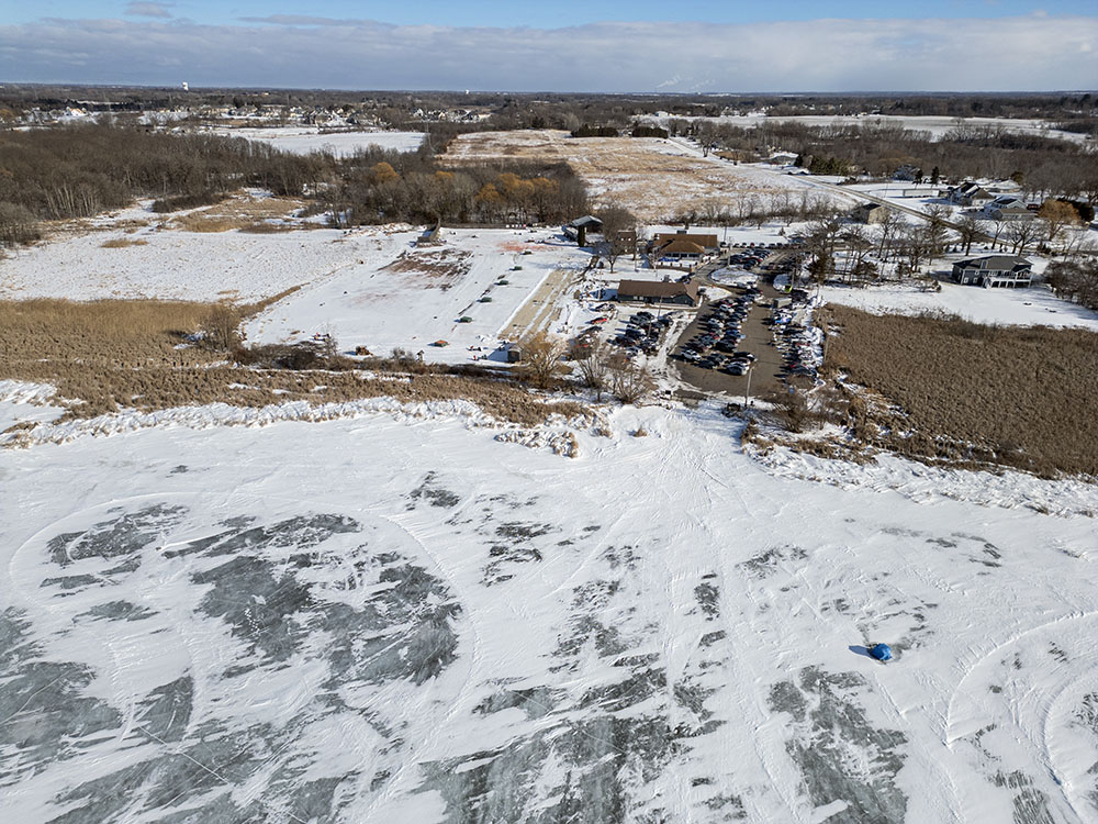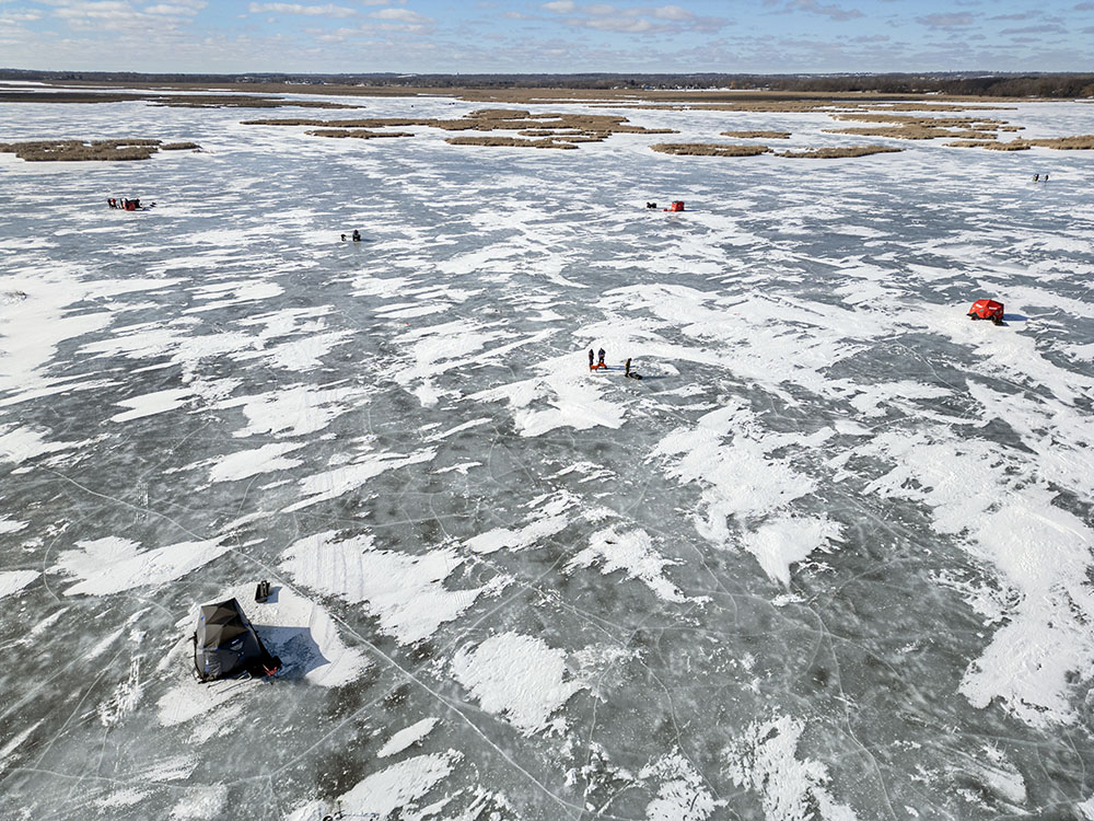 - Aerial view of ice fishing shanties
