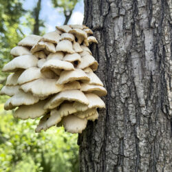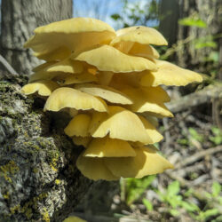 - Golden oyster mushrooms on tree trunk