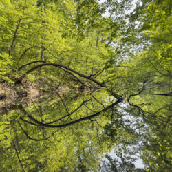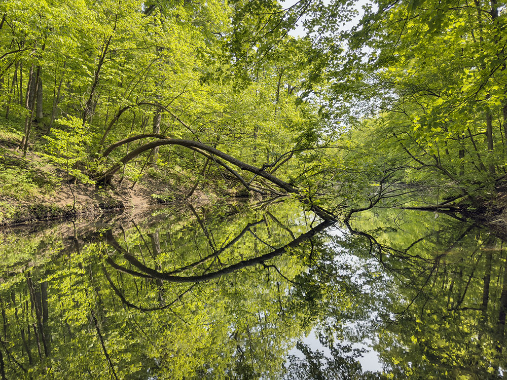 A large City of West Bend park with a glacial terrain of steep ridges and valleys. This park features trails running throughout a landscape of wetlands, small lakes and forested hills. The West Bend Segment of the National Ice Age Scenic Trail runs through it, continuing south to the Paradise Road trailhead.