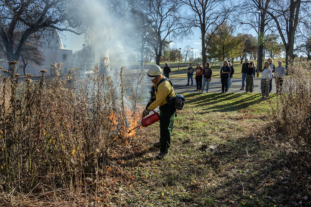Burning Washington Park, a prescribed burn conducted by the Urban Ecology Center to help control in invasive species and encourage native growth.