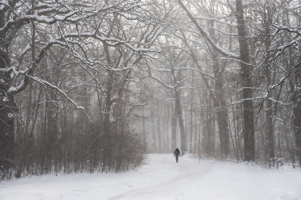 Surprisingly, I was not adventuring alone. Even more surprising, a man on a bicycle—not even one with fat tires—flitted along the snowy trail through the woods ahead of me, too fast and far away for me to capture on camera. And a quartet of young adults paused in front of a snow-covered tree for a selfie, with the wintry wilderness for a backdrop. By the time I made it back to my car the snow was thickening and the already brooding light was dimming further. I put off additional adventures for the next day.