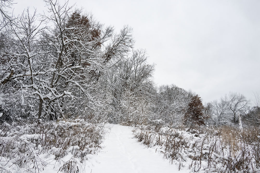 There’s no place so wild that a winter storm can’t make wilder. And when it is the first snowfall of the season, well, the psychological effect is even more pronounced. It happens even before the snow begins to fall. Prompted by catastrophizing forecasts, people besiege grocery stores expecting to hunker down for the apocalypse. Me, I get my winter weather garb out from summer storage. If I had chains for my tires I’d get them out, too. As it turned out, the plows did their job well and, because it was a Saturday and everyone else was hunkered down, the traffic was light and the speeds sensibly slow. I headed for a patch of suburban wilderness well before the storm let up.