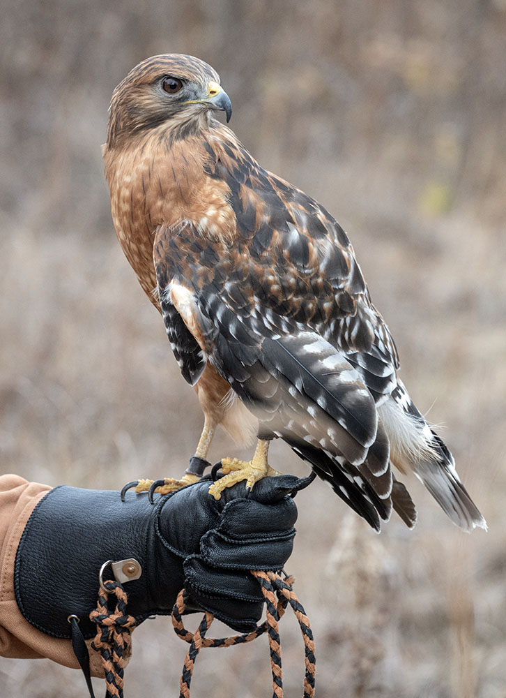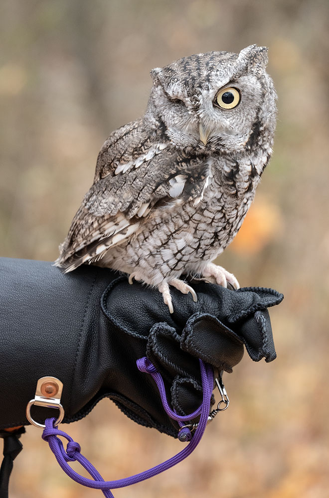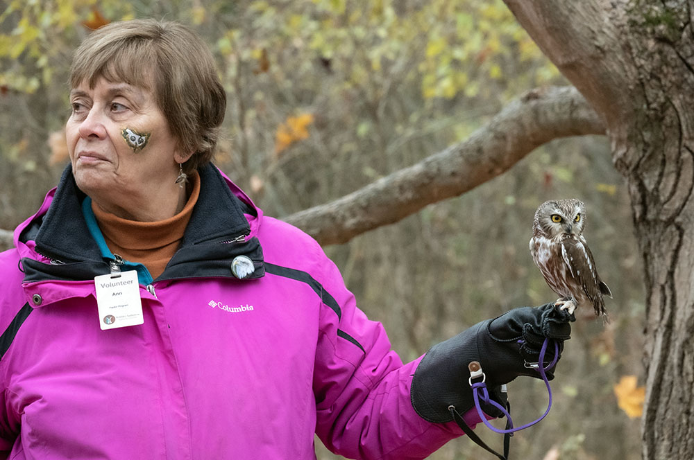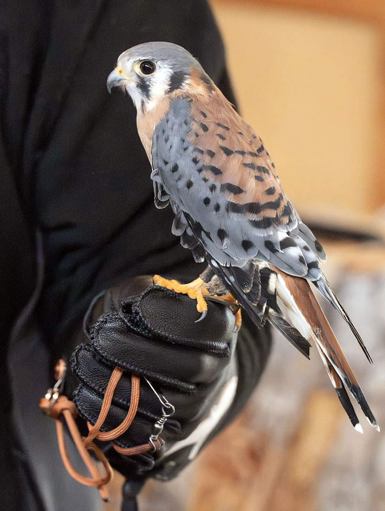 Schlitz Audubon Nature Center calls its birds “raptor ambassadors.” It currently has sixteen resident birds, including hawks, owls, falcons, eagles and two that are not raptors: a turkey vulture and an American crow. They range in size from huge—an eleven-pound eagle—to tiny—a three-and-a-half-ounce owl. All live at the center full-time because they are, for a variety of reasons, non-releasable. Among the reasons are diverse injuries and being raised from an early age among humans. Whatever the reason, the resident birds would not survive in the wild if released.